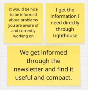 - When asked how they were kept up to date with information about new changes to Lighthouse all participants identified one or multiple sources provided by Guardian360. The current information system seemed to be working.