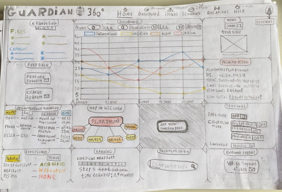 When I joined Guardian360 I asked to see all the related design documents the company had produced over the years to familirize myself with the new project and all the design work that had been done before. However due to time and resource constraints next to no documentation existed to learn from. So during my stay I put in extensive work to provide the company with design tools and artifacts that could be referenced and used in the future to help ease design work for those coming in after me. This includes but is not limited to the design artifacts you have seen so far in this project.