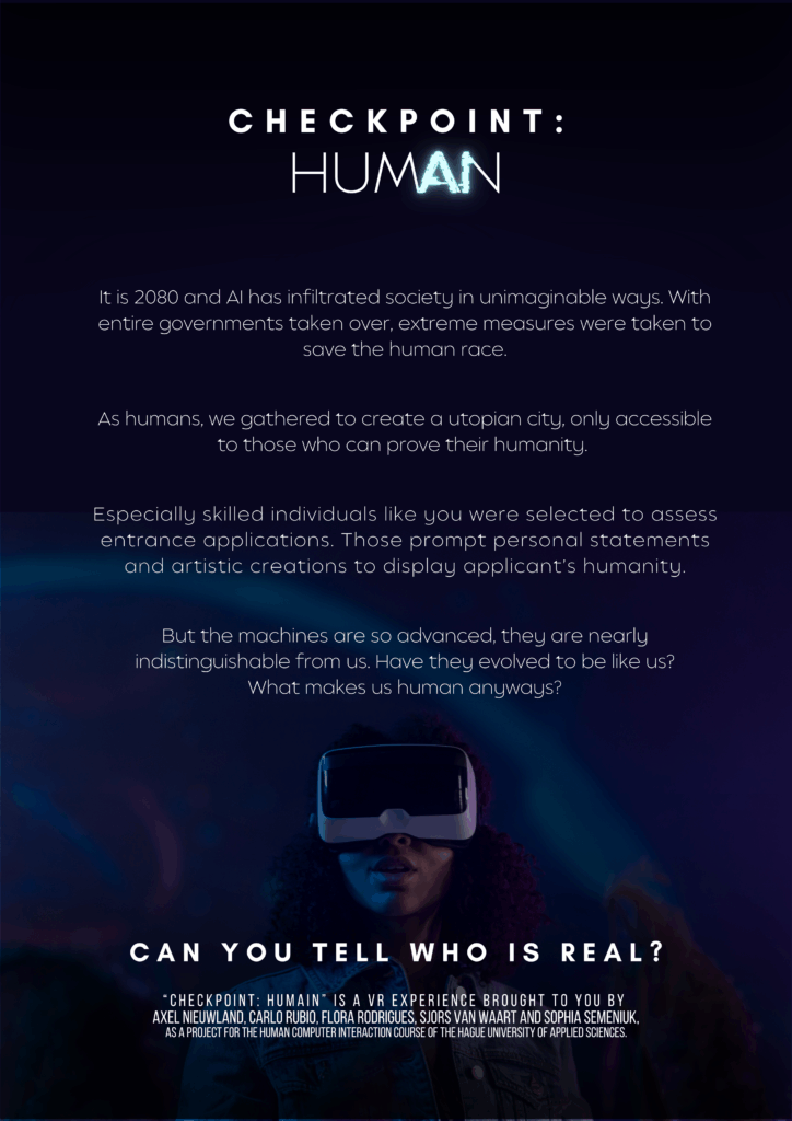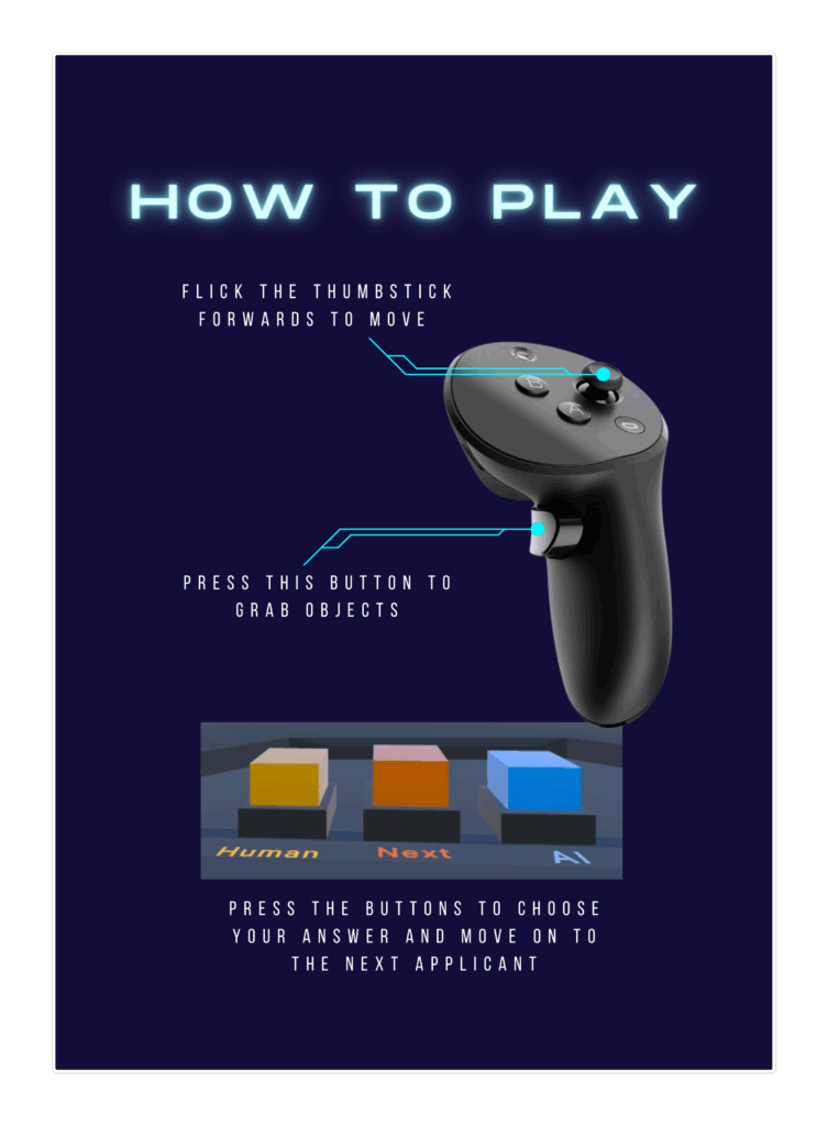 Eventually we landed upon a topic we wanted to explore, that of artificial intelligence and how it was getting harder to tell the difference between something made by a man or a machine. After we decided on that topic, we quickly came up with an idea to express this directly to our users. In our event a singular user would be put inside of an office like space where they would be presented with various artifacts (pictures, audio & videos) and after inspecting/viewing each artifact they would decide through buttons which category the artifact belonged to [Human] or [AI]. After inputing their anwser the user would be shown wheter they were wrong or rigth in their assumptions.
