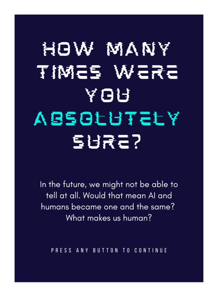 When a user reviewed the final artifact, we presented them with a message that conveyed our topic directly and that would hopefully push our users to think about their own perception in a fast changing and evolving tech world.